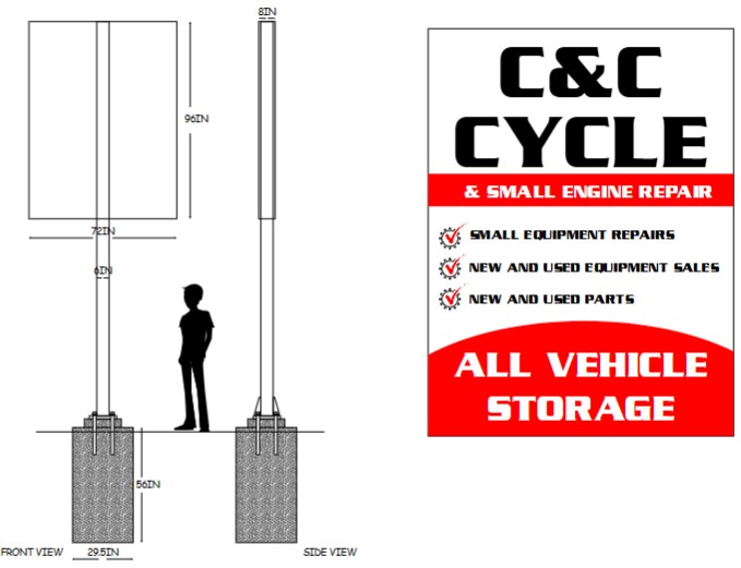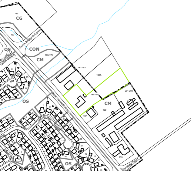 The City is in receipt of an application for 185–195 Commonwealth (DA25-0711) to install a pylon sign in the front yard setback of C & C Cycle in the Commercial Mixed zone (CM). The proposal is subject to Regulations 4.5 and 4.17, requiring Discretionary powers of Council and public notice.