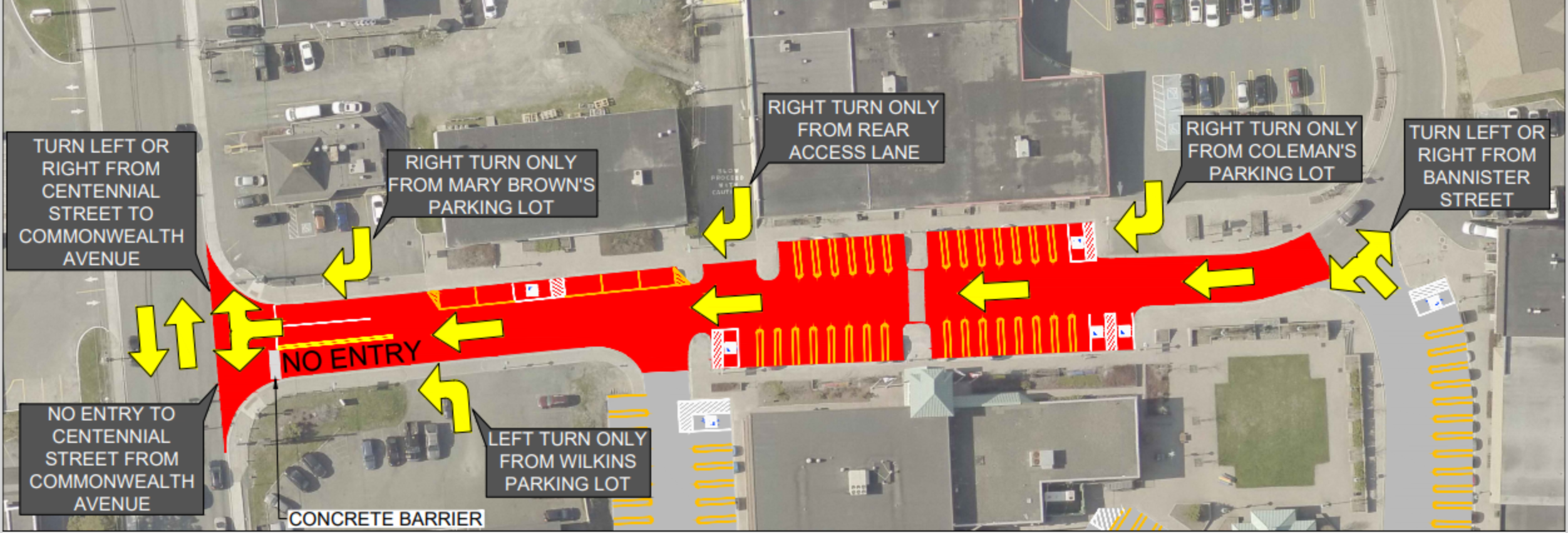 During this one-way pilot project, there will be NO vehicular access to Centennial Street from Commonwealth Avenue. Traffic entering Centennial Street from Bannister may turn left or right at the intersection. There will still be access to Centennial Street via Park Avenue.